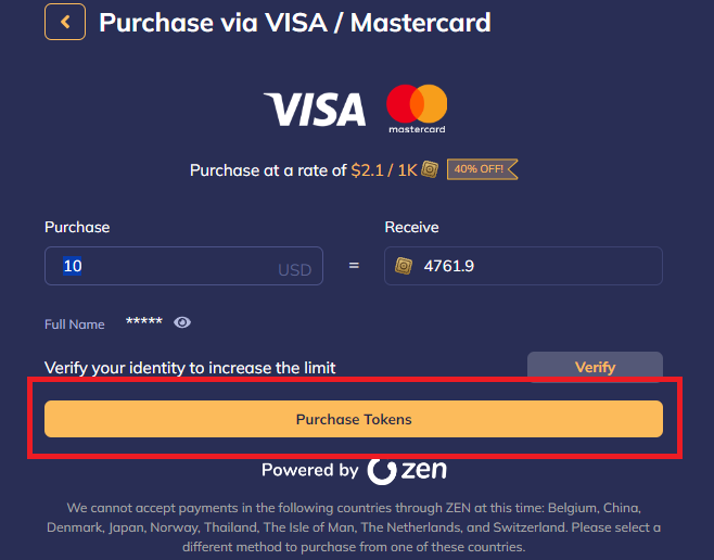 Selected a small amount of 10 USD, used the full name of the cards owner.
