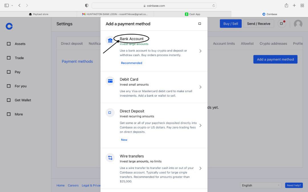 4. Coinbase currently has many payment options that you can use to make purchases, but our main focus is on how to buy btc using ba logs, so just select "bank account" as your payment method.