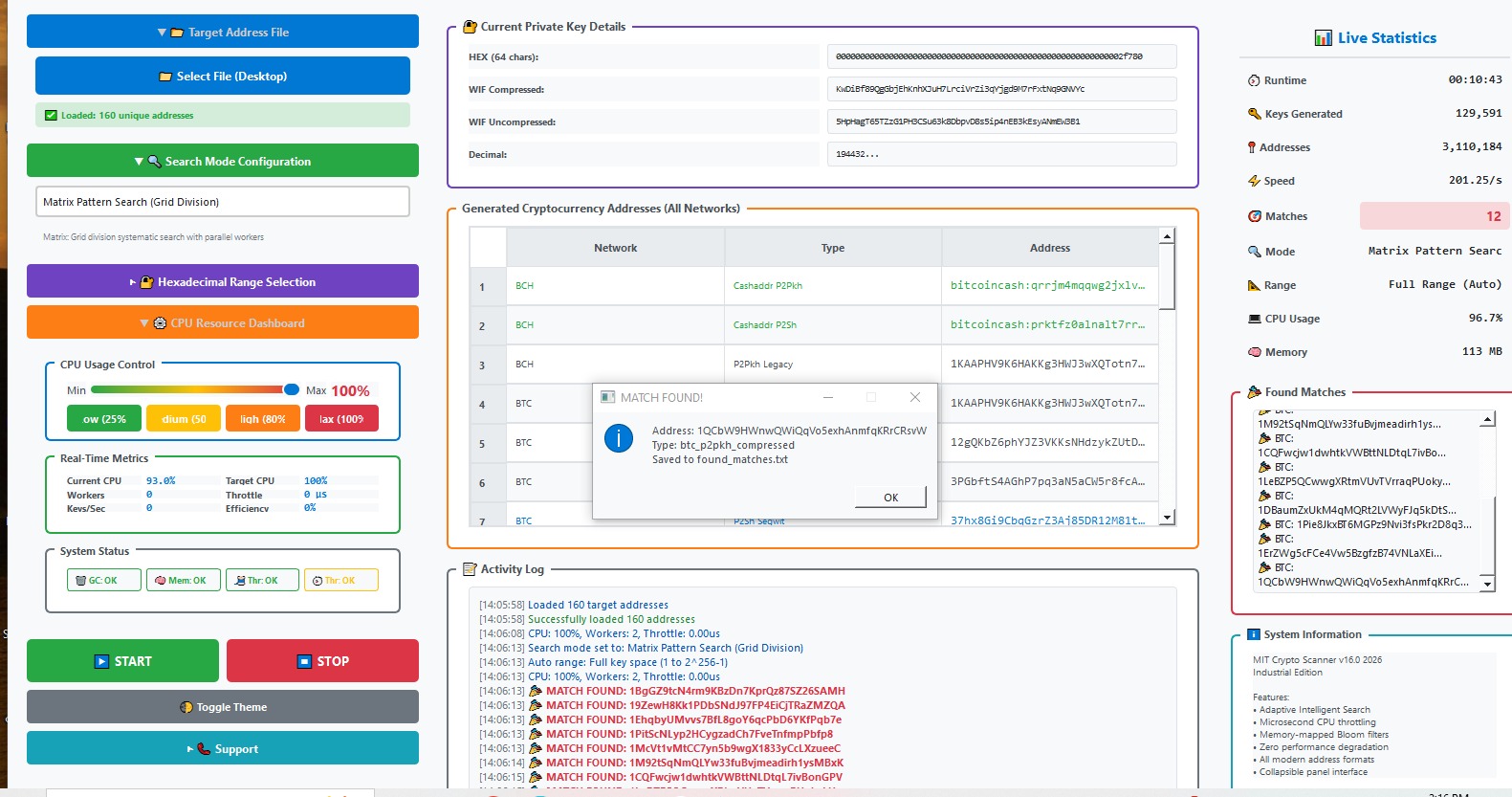 Crypto Scanner is a professional, enterprise-grade cryptocurrency address scanner that generates private keys and checks them against a target list of addresses across 5 major cryptocurrencies with complete 2025 format support.